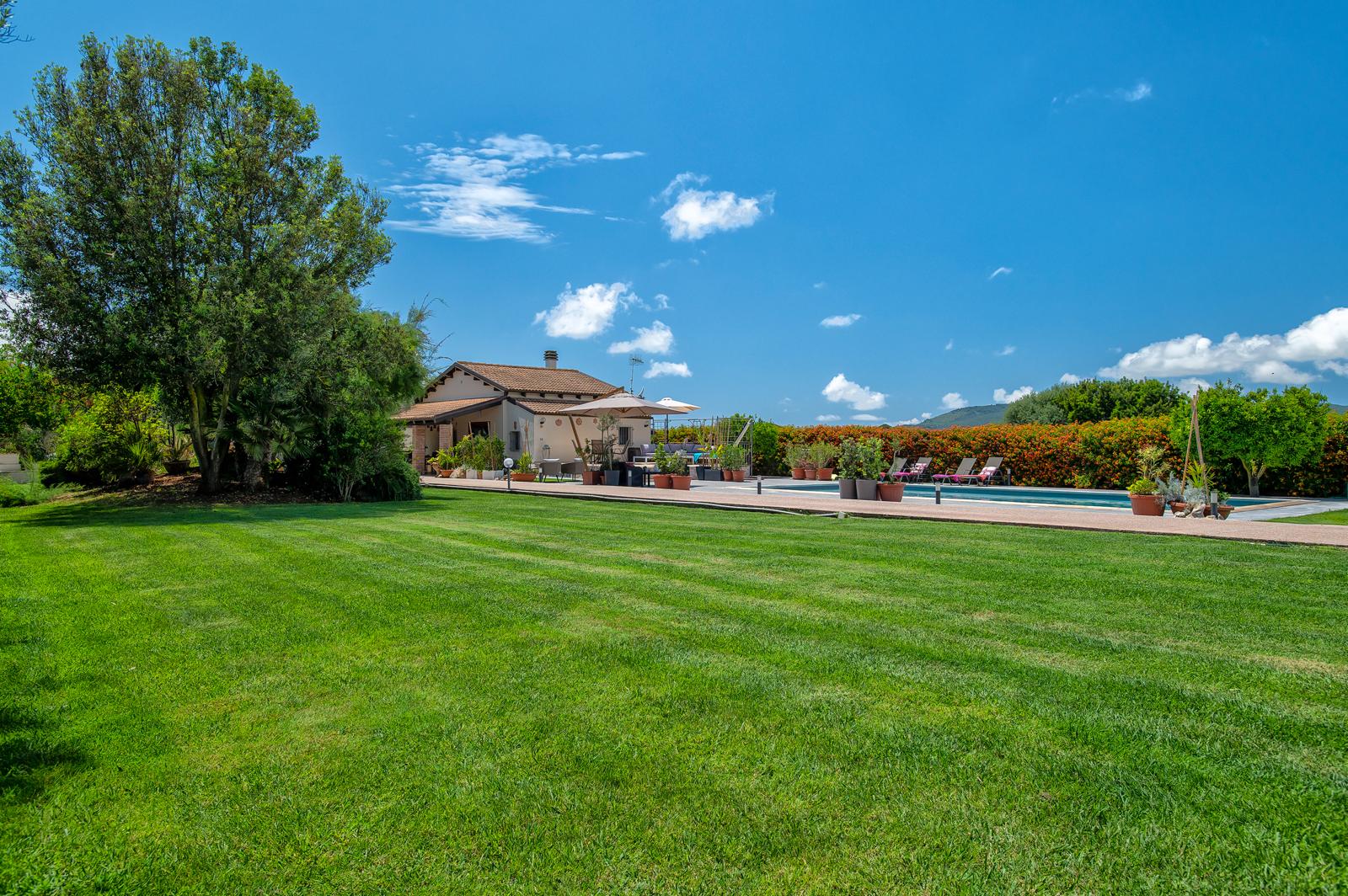 Il giardino, curatissimo e arricchito da alberi ad alto fusto e arbusti ornamentali, avvolge la villa offrendo massima privacy e tranquillità.
