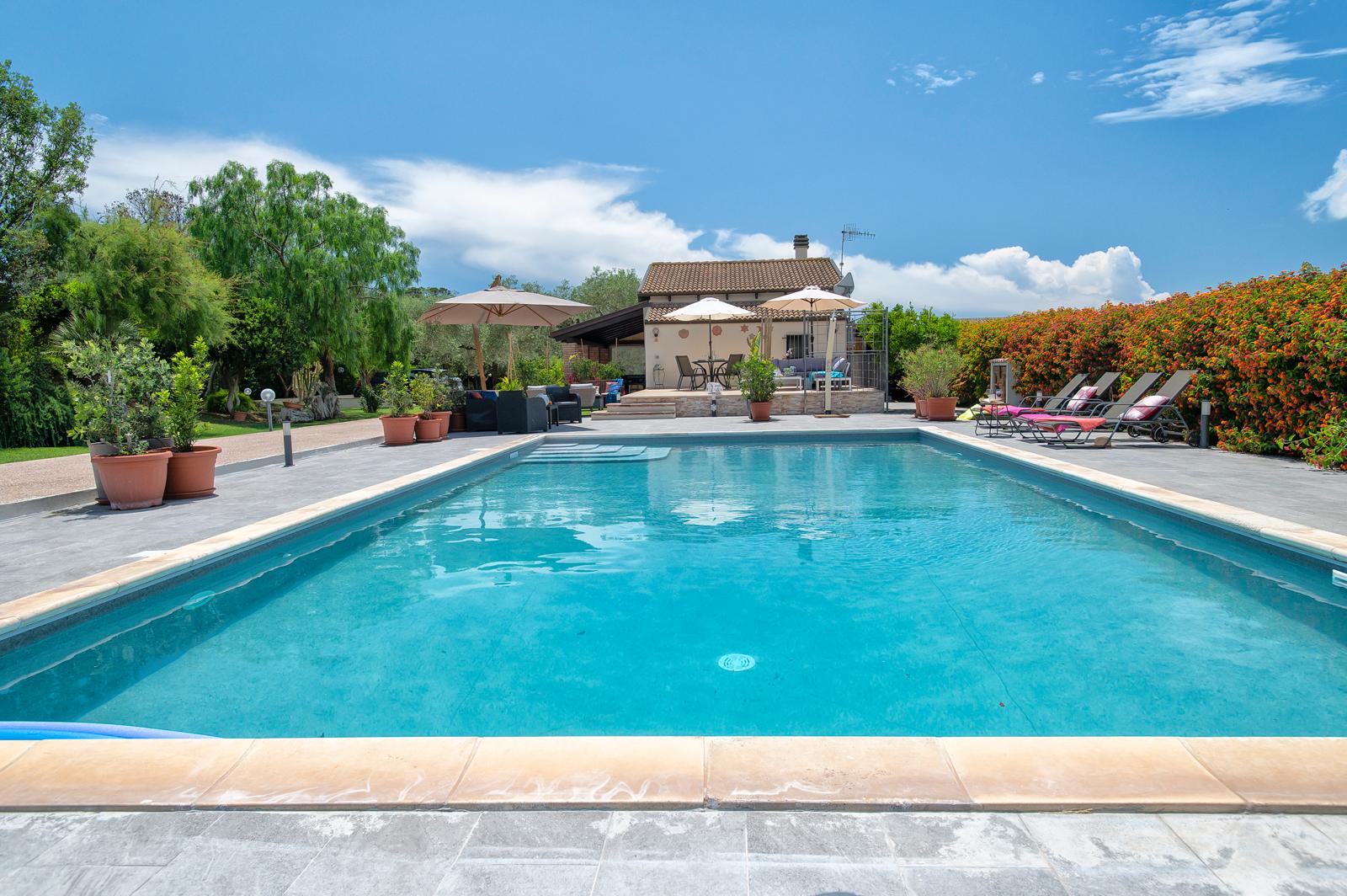 La piscina è dotata di copertura automatica alimentata da sistema fotovoltaico, con batteria e comando a distanza, che ne consente l’apertura e la chiusura in modo rapido, sicuro e sostenibile.